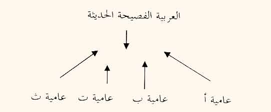 فمن المعروف أن العربية الفصيحة الحديثة، من جهة، والعاميات العربية، من جهة أخرى، كلتيهما في حركة رأسية: العربية الفصيحة الحديثة في حركة هـابطة، بحيث تجعلها مفهومة أكثر من الناس البسطاء، والعاميات العربية في حركة صاعدة لتقترب أكثر من العربية الفصيحة الحديثة. ويمكن لنا أن نشبه الموقف بالرسم الآتي: [ ص: 86 ]